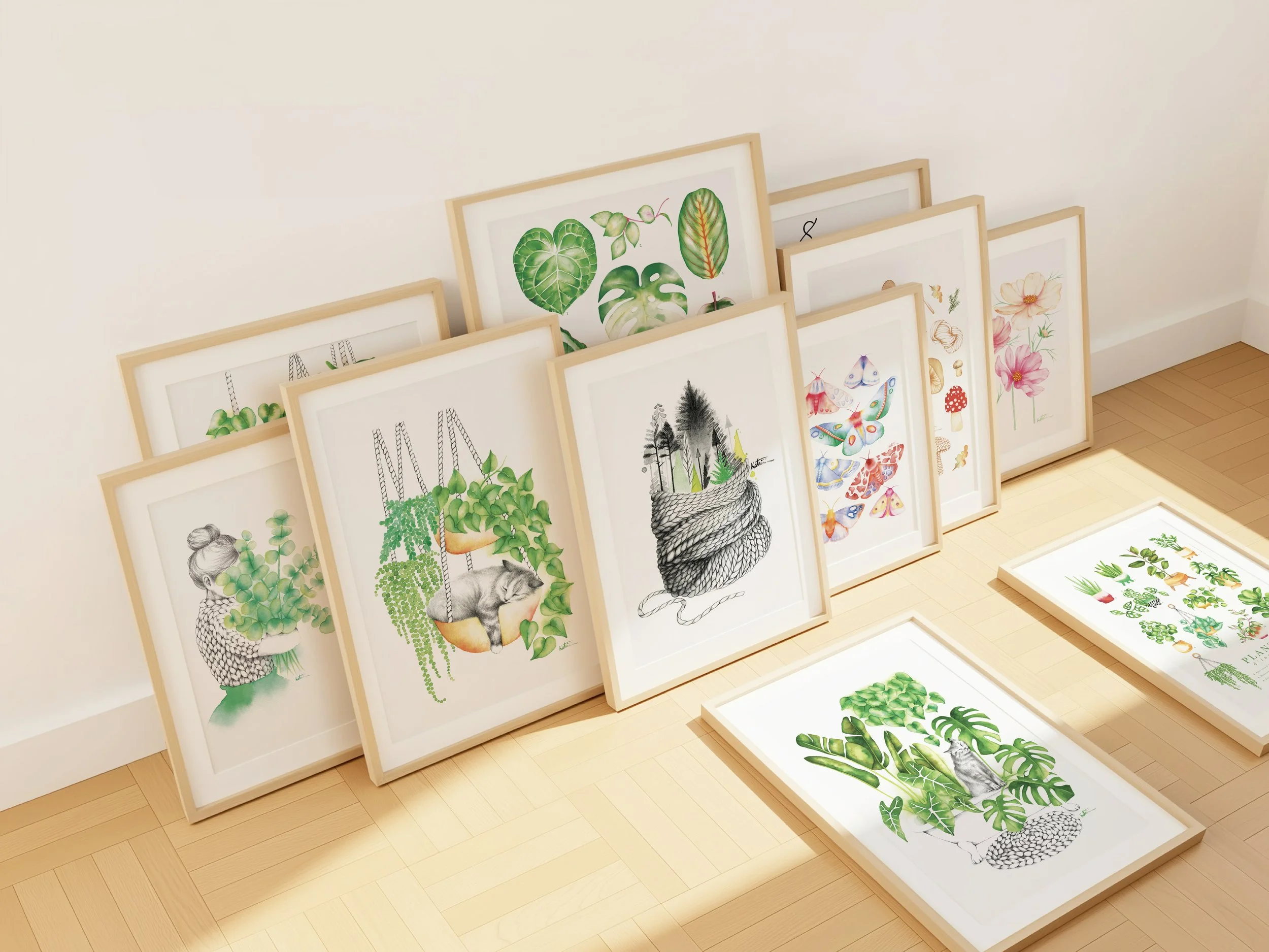 Mes inspirations sont les petites beautés du quotidien, passant du tricot à mes plantes d’intérieur, aux différents éléments de la nature et à l'urbanité qui m'entoure. Mes illustrations sont créées délicatement avec mes mains, mon amour, de l’aquarelle, des crayons de bois, du pastel et du graphite.